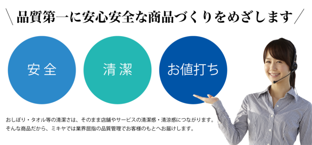 衛生面と品質へのこだわり、 安全で清潔なおしぼり・タオル等をお届けします
